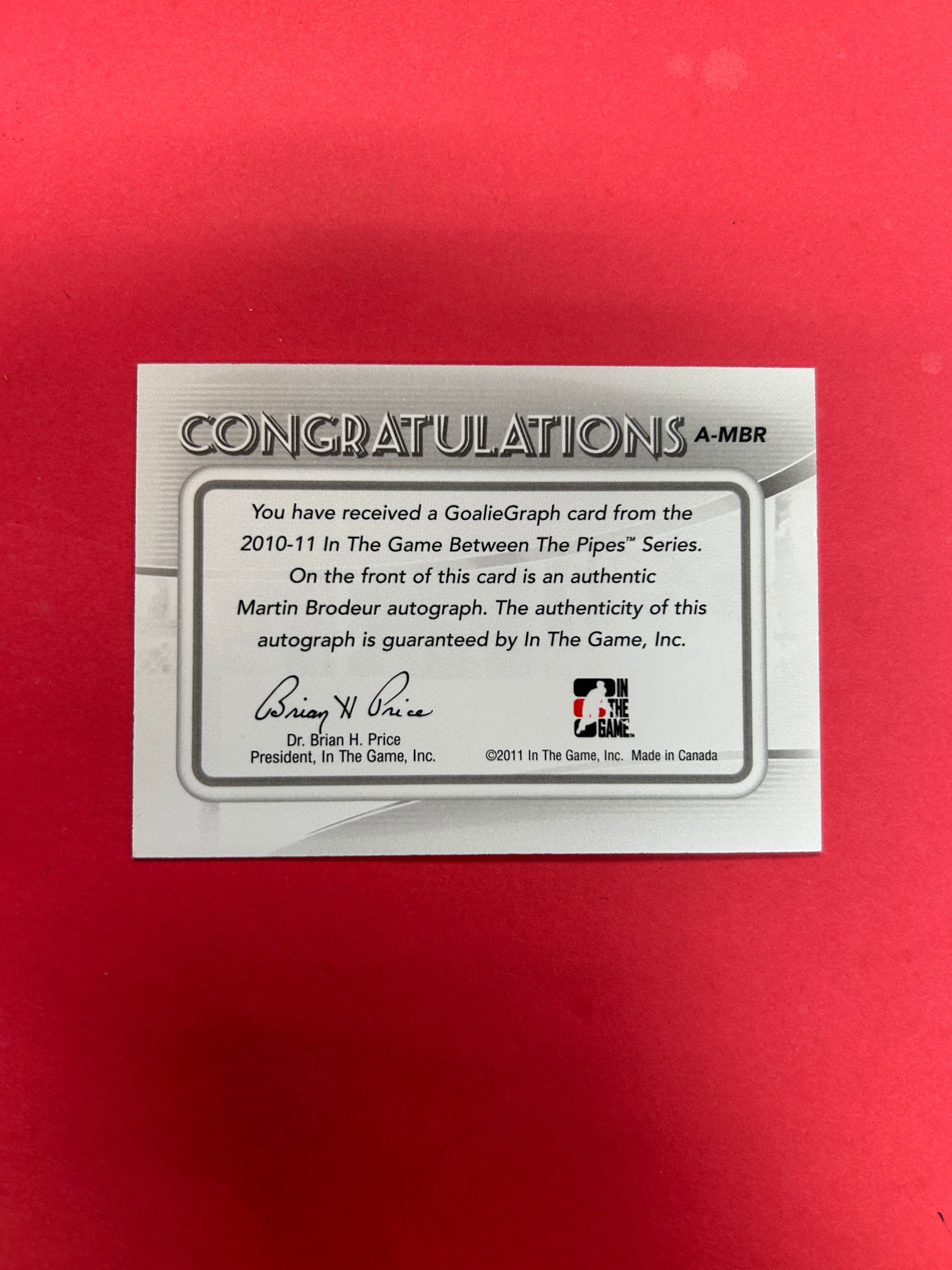 This is it! 2010-11 IN THE GAME BETWEEN THE PIPES MARTIN BRODEUR AUTOGRAPH