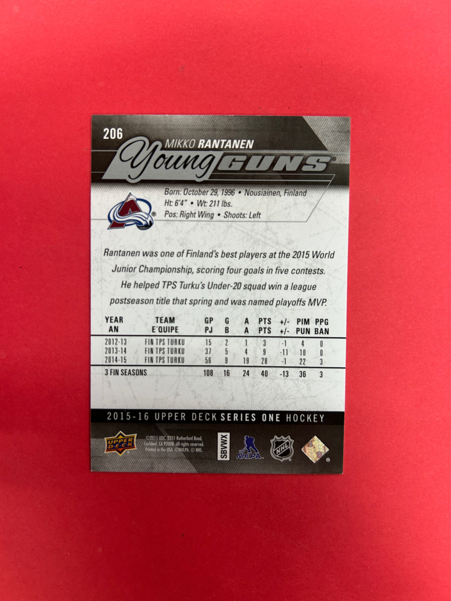2015-16 UPPER DECK SERIES 1 MIKKO RANTANEN YOUNG GUNS AUTOGRAPHED IN PERSON