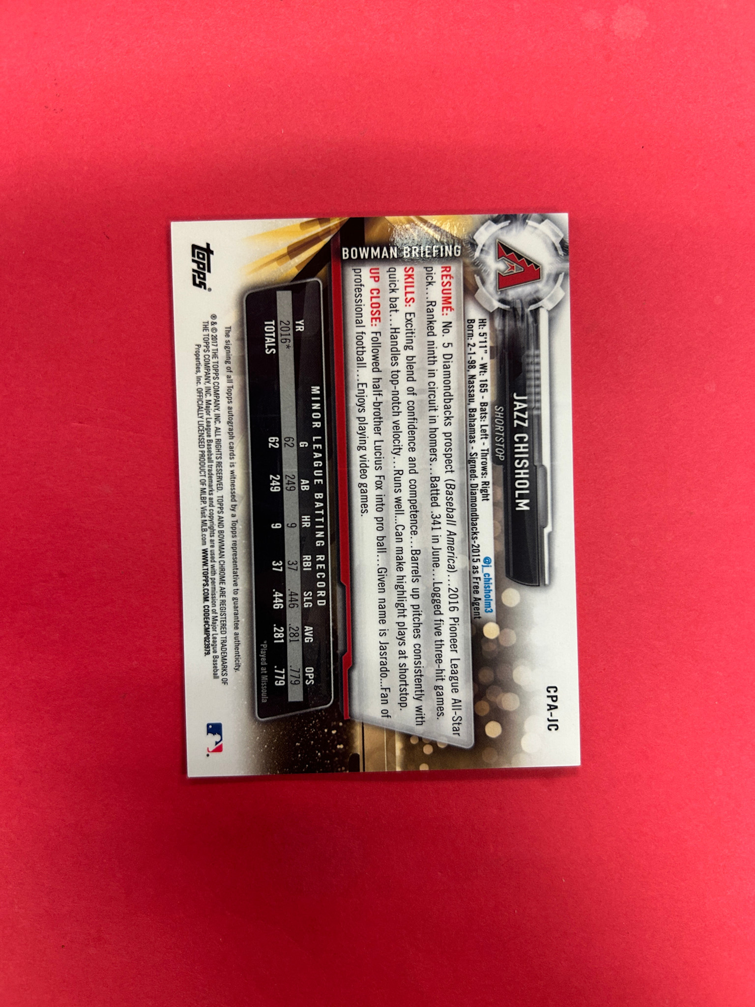 2017 BOWMAN CHROME JAZZ CHISHOLM 1ST BOWMAN ROOKIE AUTO
