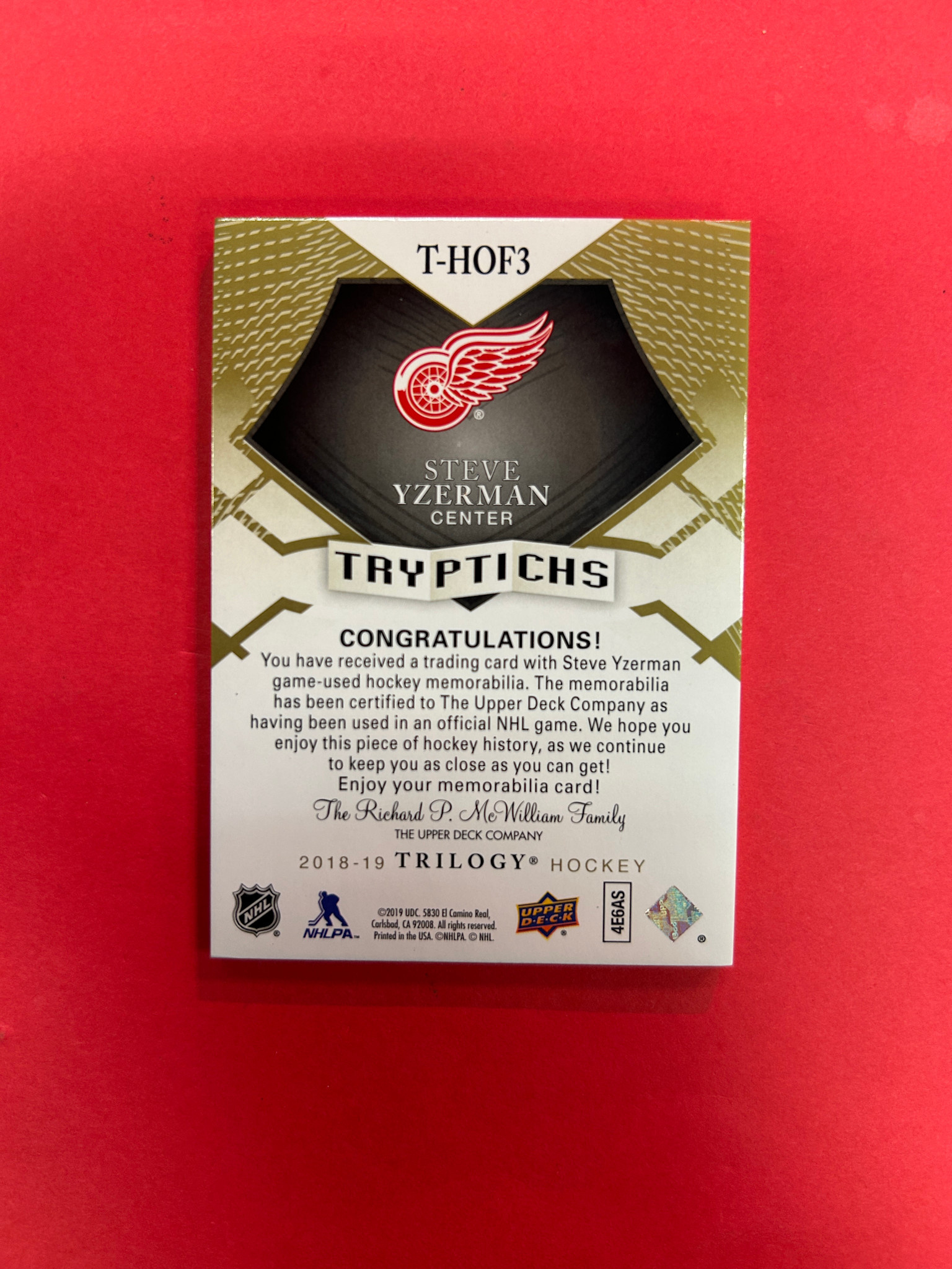 2018-19 UPPER DECK TRILOGY STEVE YZERMAN TRYPTICHS STICK /10