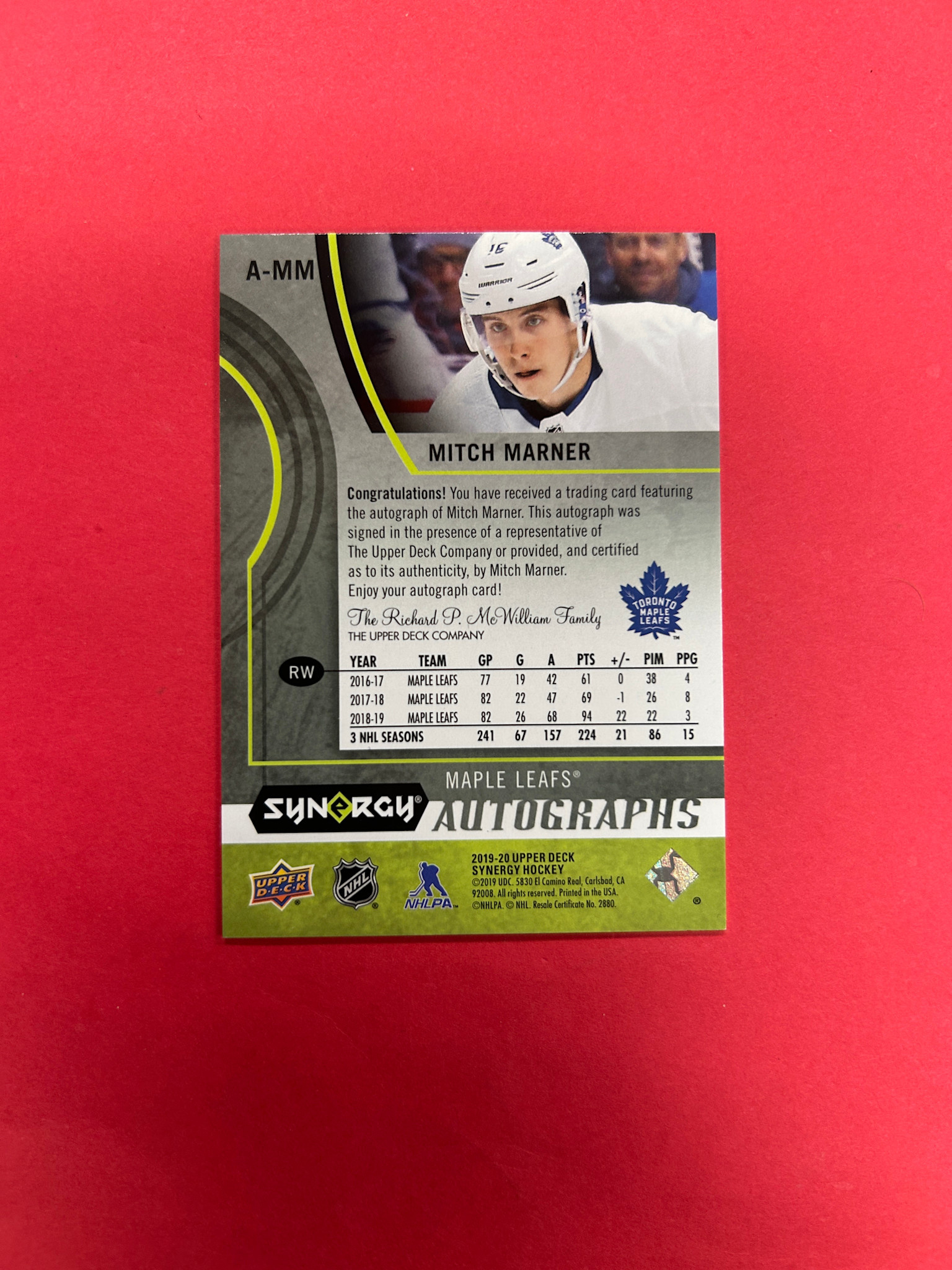 2019-20 UPPER DECK SYNERGY MITCH MARNER AUTOGRAPHS