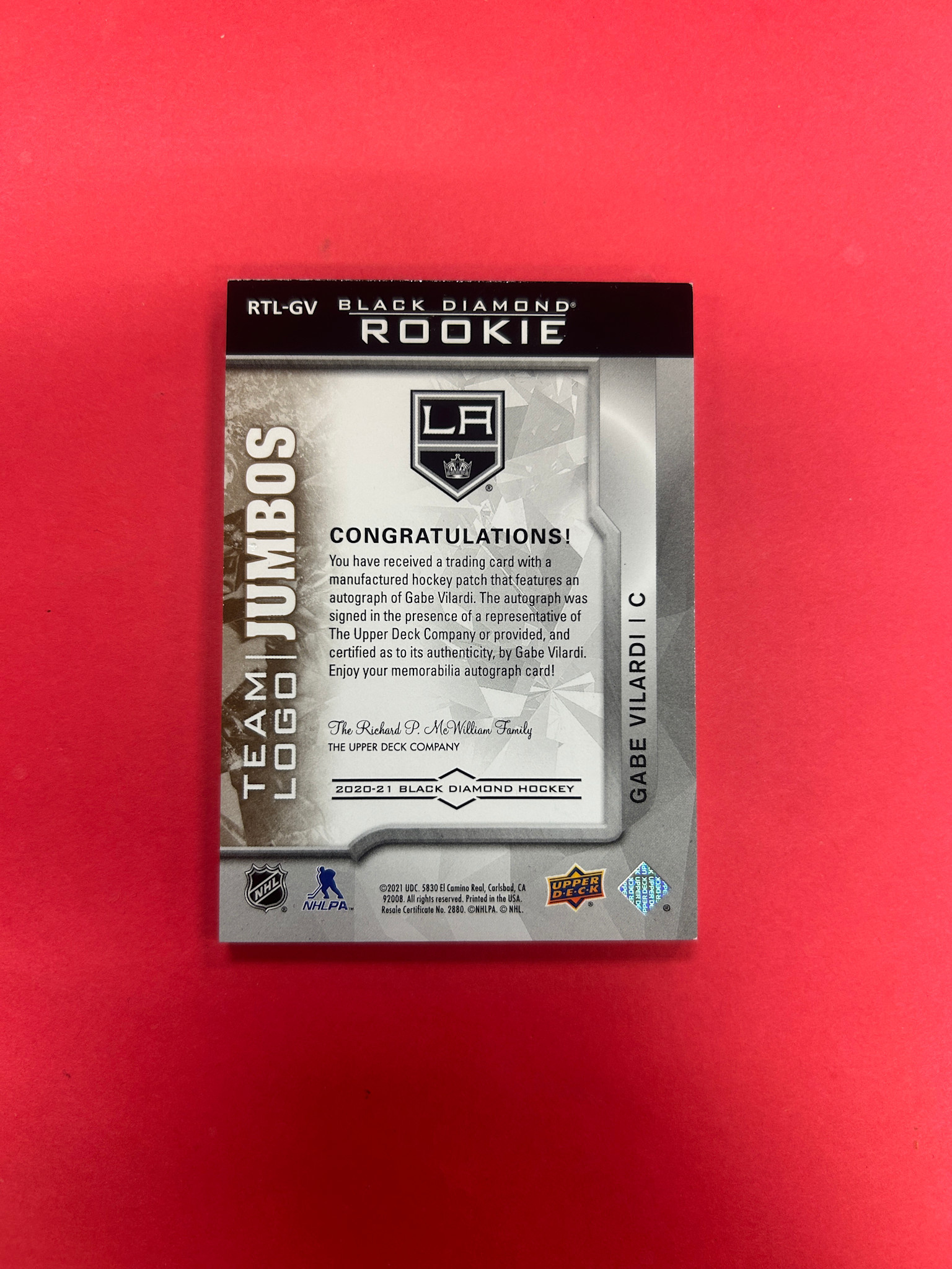 2020-21 UPPER DECK BLACK DIAMOND GABRIEL VILARDI TEAM LOGO JUMBOS AUTO PATCH /25