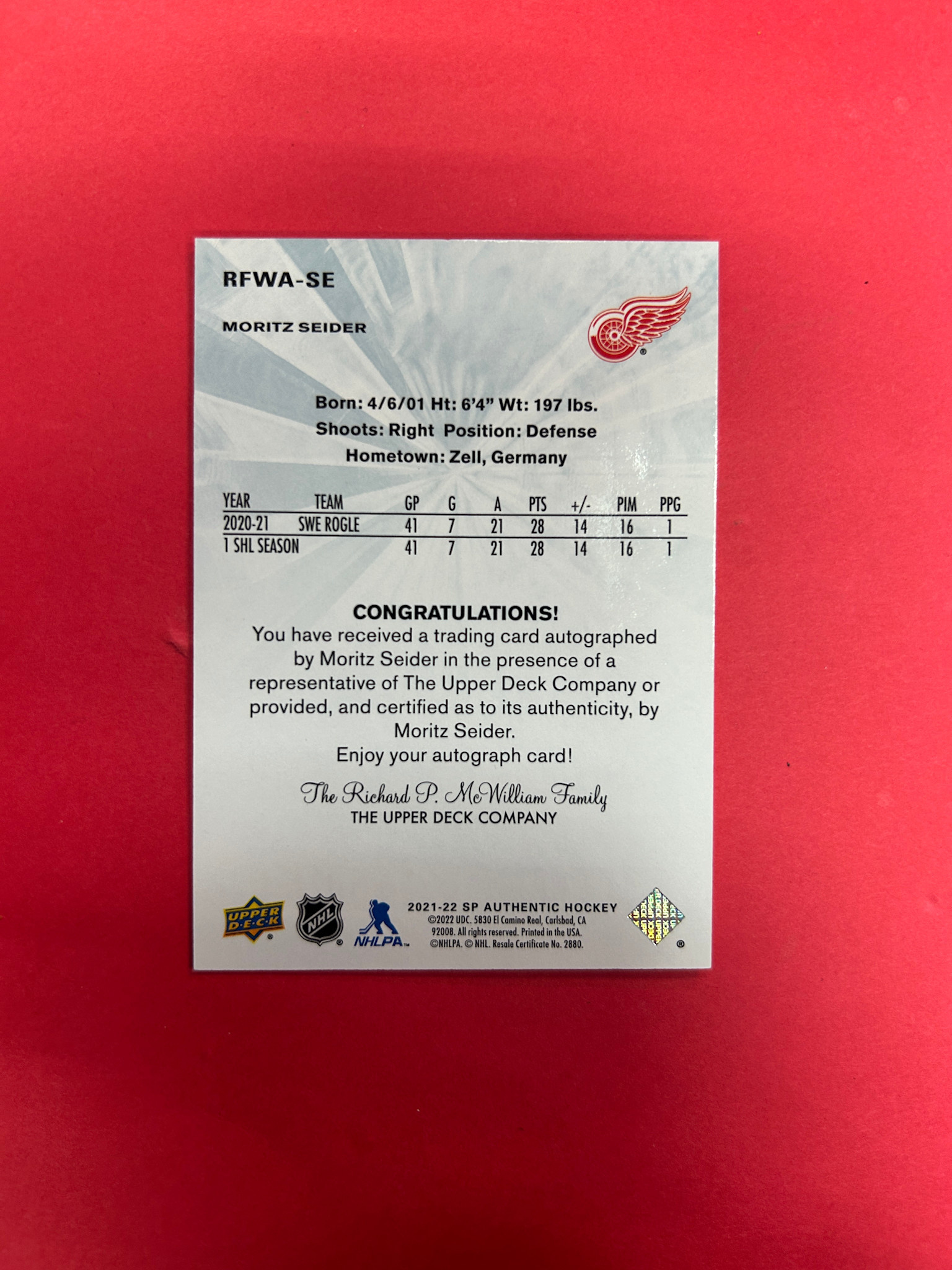 2021-22 SP AUTHENTIC MORITZ SEIDER FUTURE WATCH AUTO RETRO /99