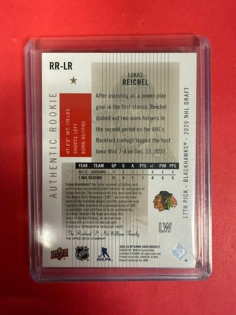 This is it! 2022-23 SP GAME USED AUTHENTIC ROOKIE RETRO PATCH AUTO LUKAS REICHEL 15/15 #RR-LR