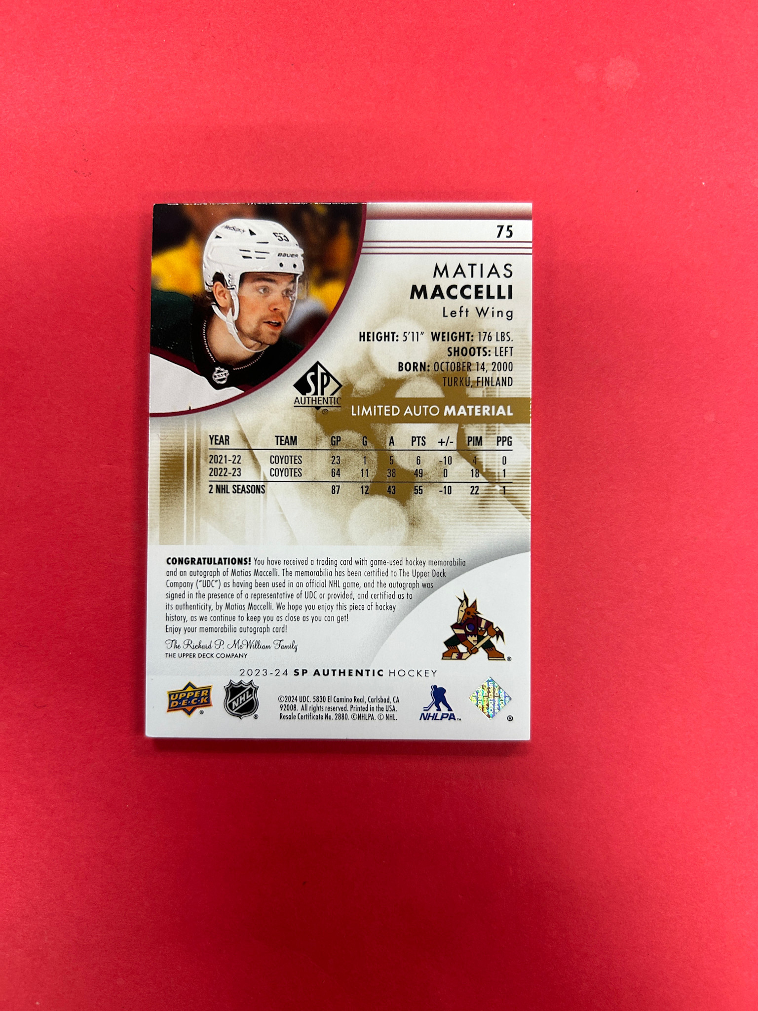 2023-24 SP AUTHENTIC MATTIAS MACCELLI LIMITED AUTO PATCH /100