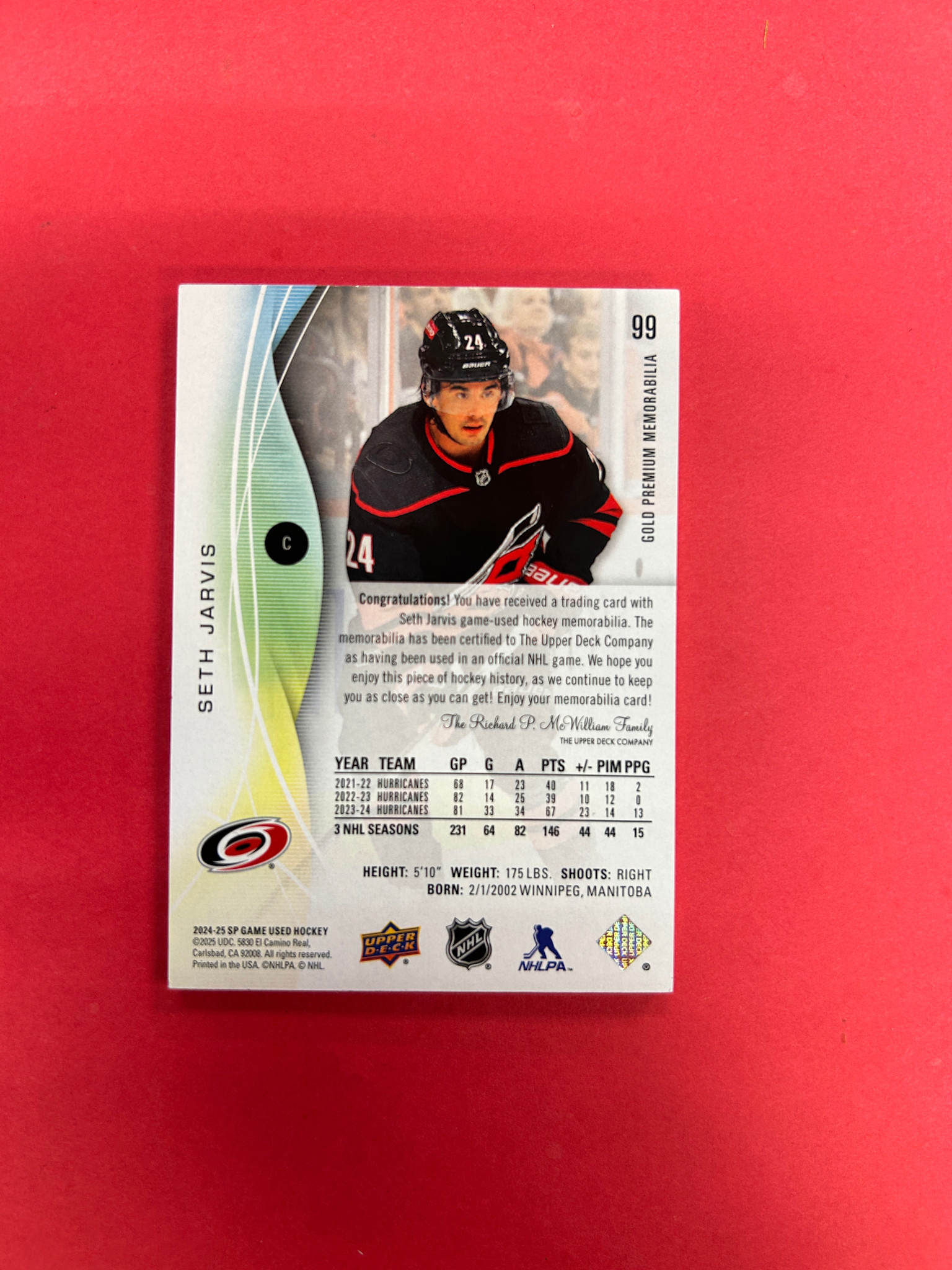 2024-25 UPPER DECK SP GAME USED SETH JARVIS PREMIUM MEMORABILIA PATCH /15