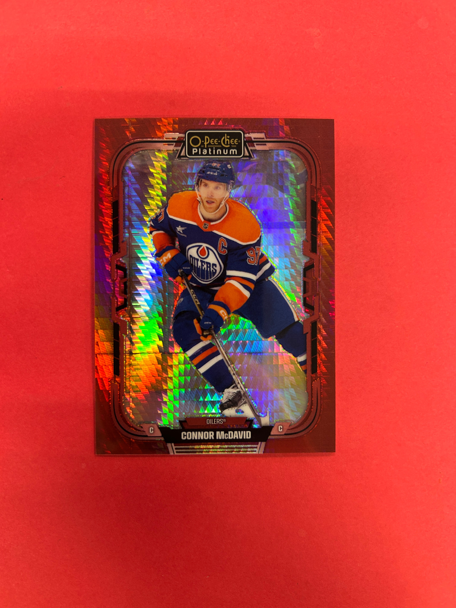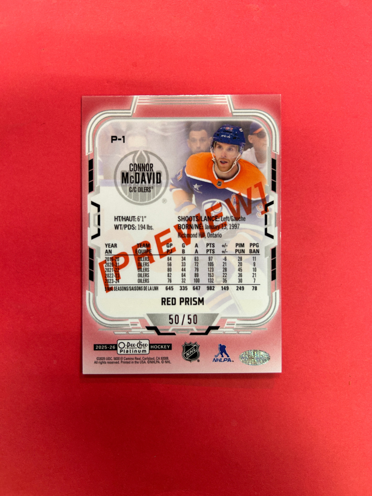 This is it! 2025-26 OPC PLATINUM CONNOR MCDAVID RED PRISM PREVIEWS 50/50