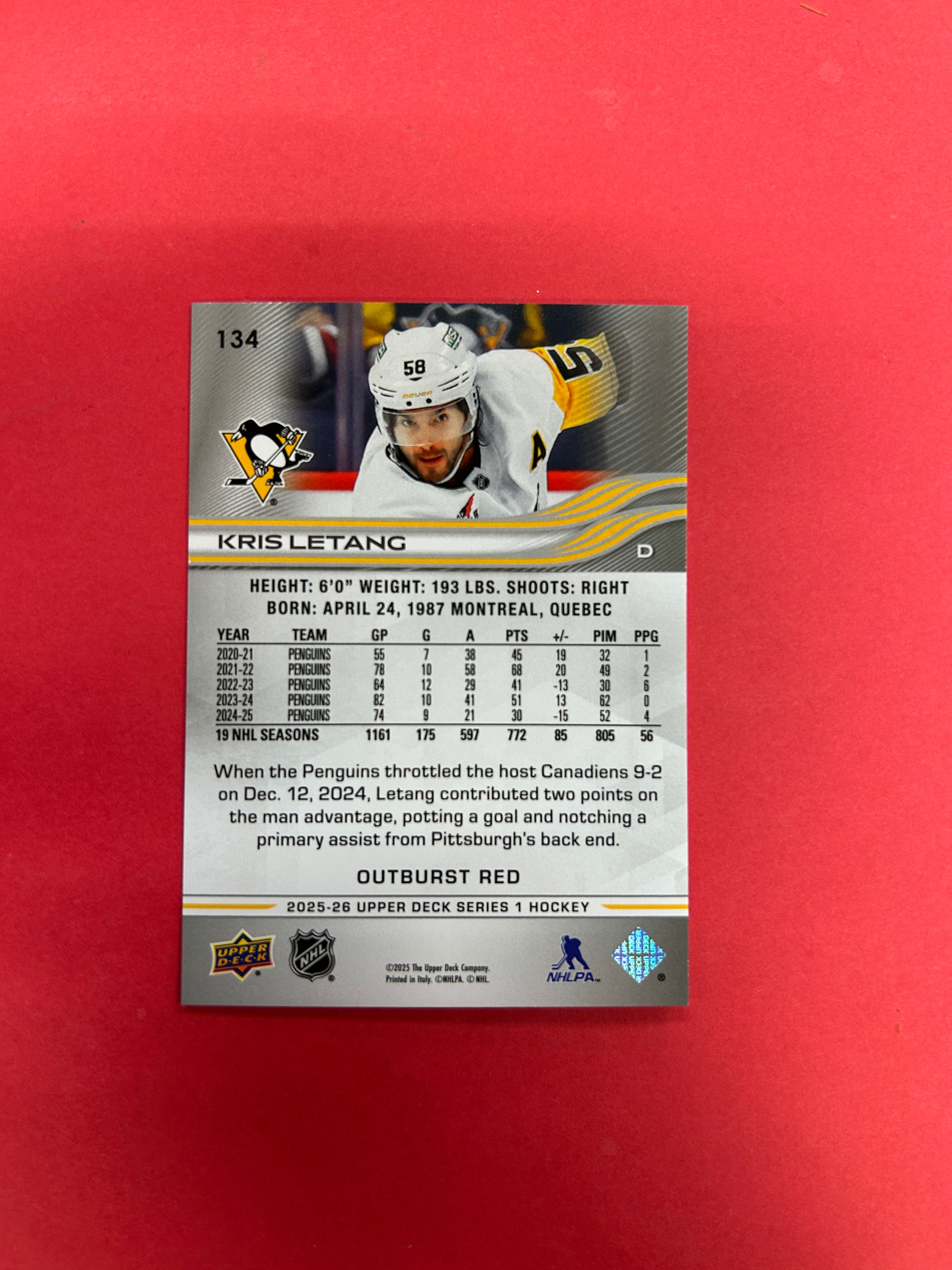 This is it! 2025-26 UPPER DECK SERIES 1 KRIS LETANG RED OUTBURST /25