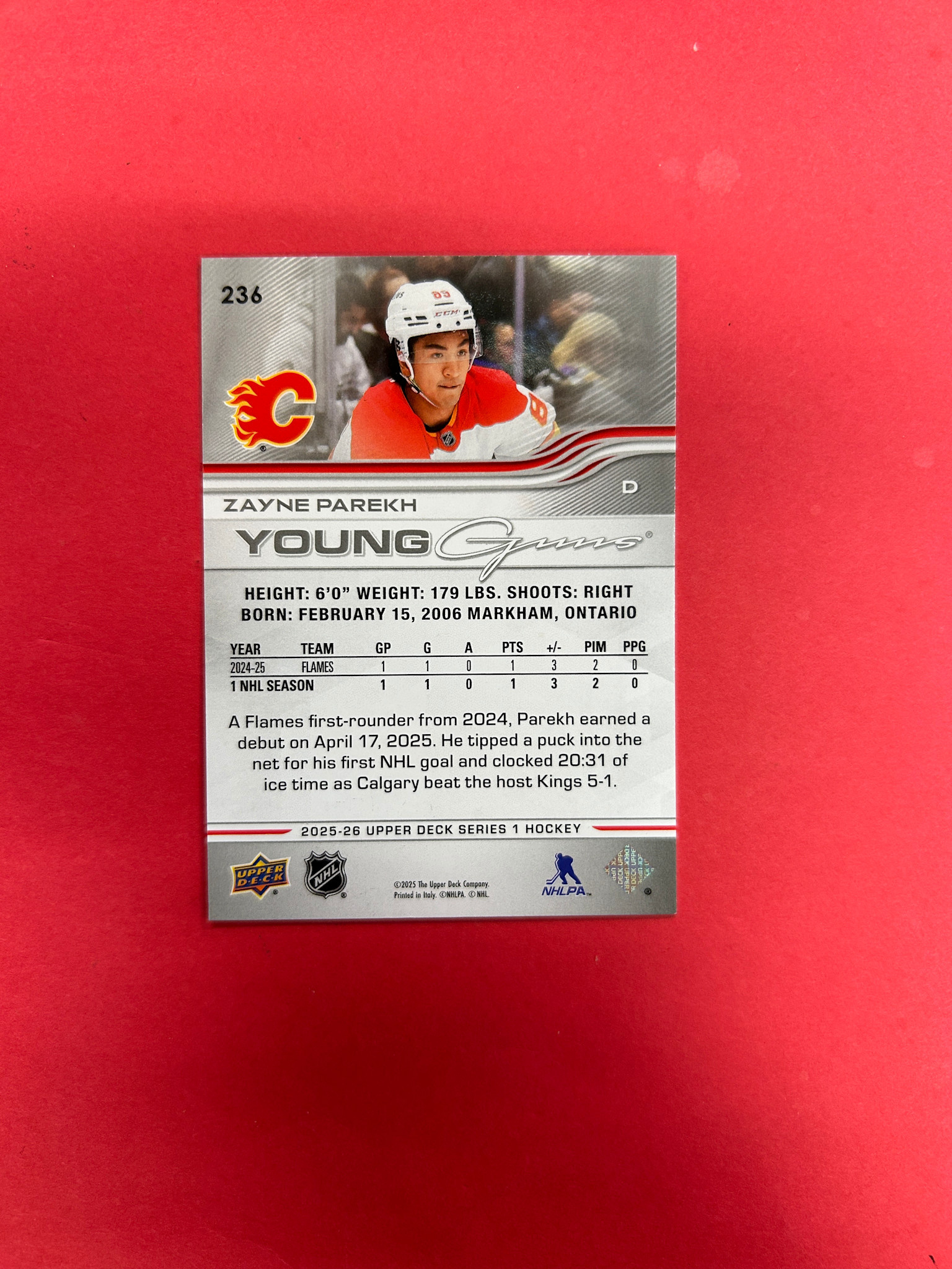 2025-26 UPPER DECK SERIES 1 ZAYNE PAREKH YOUNG GUNS