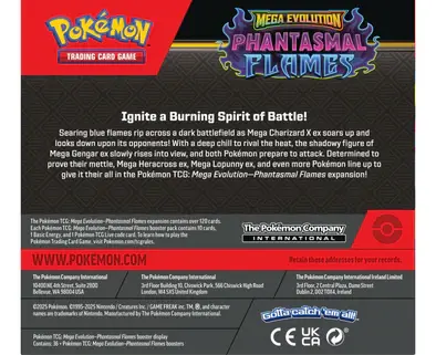 Searing blue flames rip across a dark battlefield as Mega Charizard X ex soars up and looks down upon its opponents! With a deep chill to rival the heat, the shadowy figure of Mega Gengar ex slowly rises into view, and both Pokémon prepare to attack. Determined to prove their mettle, Mega Heracross ex, Mega Lopunny ex, and even more Pokémon line up to give it their all in the Pokémon TCG: Mega Evolution— Phantasmal Flames expansion!