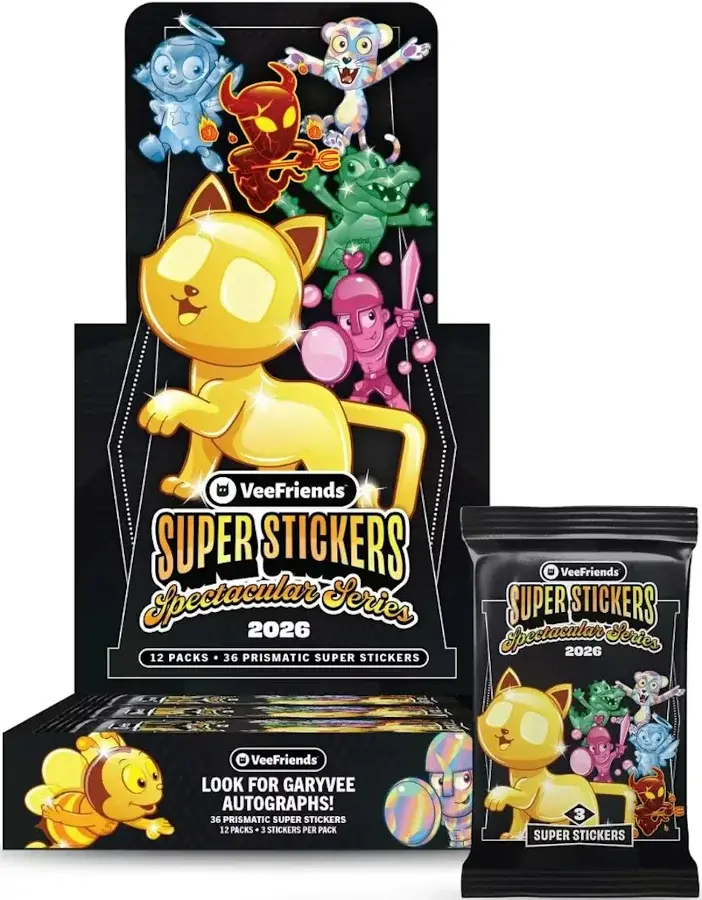 The 2026 Super Stickers: Spectacular Series expands the VeeFriends sticker universe with new formats, foil treatments, debut characters, and the first-ever fully serialized Super Sticker parallels. Collectors can chase Spectacular Matches, Diamond Die Cuts, Comic Variants, 5 Year OG Art, GaryVee autographs, and exclusive inserts only found in the box format. With 36 stickers per box, Mini Stickers, and scratch-off codes that could unlock a 1/1 VeeFriends Series 2 Spectacular NFT, this release elevates both rarity and innovation. Shipments begin February 2026, marking a major milestone in the evolution of VeeFriends physical collectibles.